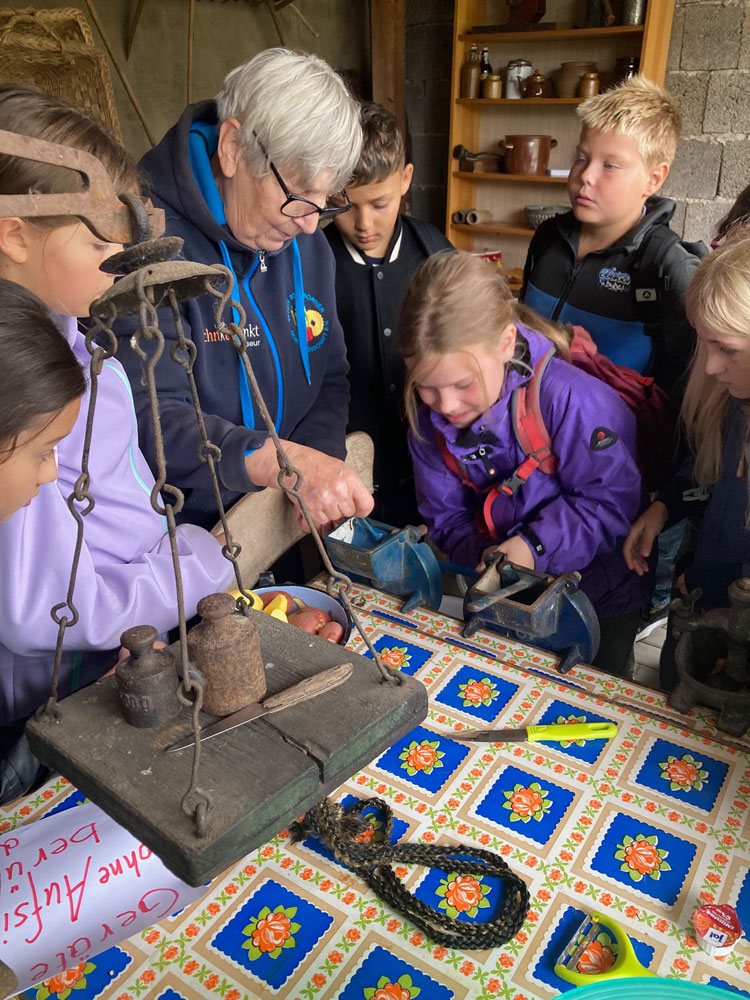 Zum einem stöberten die Schüler in dem Rohrborner Dorfmuseum. In diesem hat Jutta Rottorf diverse historische Möbel und Gegenstände aus Sammlungen von vielen Hausstandsauflösungen des Dorfes gesammelt und in ihrem selbst angelegten Museum auf ihrem Grundstück zusammengetragen. Dabei konnten die Kinder eine alte Einrichtung zweier Räume betrachten und verschiedene Gegenstände aus der früheren Zeit benutzen. Dazu zählten beispielsweise eine Kartoffelpresse, eine Bohnenschneidemaschine, eine Saftpresse, eine Körperwaage und vieles weitere. Diese Gegenstände konnten Sie mit frischem Gemüse und Obst ausprobieren. Die mitgebrachten Äpfel vom Hinweg konnten die Kinder somit selbst pressen und ihren eigenen Apfelsaft herstellen.