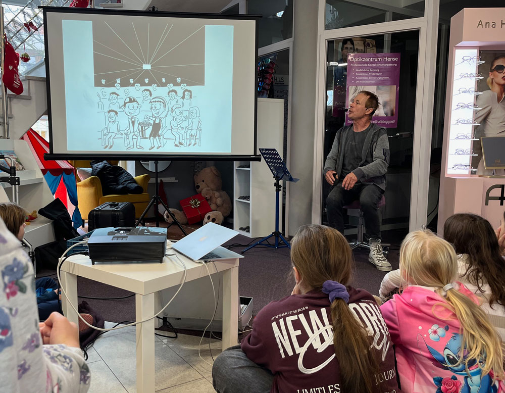(20.11.2025) Im Zeichen des Lesens stand die vorletzte Novemberwoche im Landkreis Sömmerda. Im Rahmen der 4. Thüringer Kinder- und Jugendliteraturtage hat unsere Stadt- und Kreisbibliothek Sömmerda sage und schreibe 32 Lesungen für Kinder und Jugendliche in vier Tagen (19.-22.11.2025) organisiert. Die vierten Klassen waren an einen besonderen Leseort eingeladen. Das Optikzentrum Hense hatte Vormittag des 20. Novembers für alle Kunden geschlossen und öffnete seine Geschäftsräume stattdessen für die Kinder der 4a und 4b.