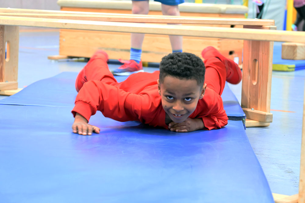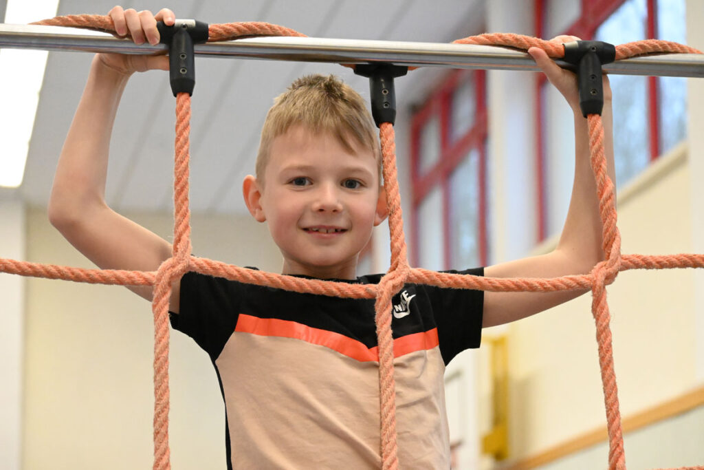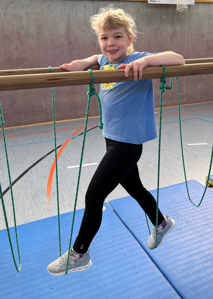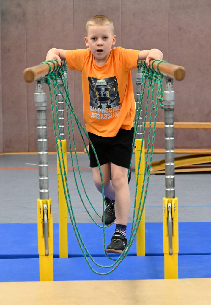 Besonders beliebt ist der steile Mattenberg, der mit Hilfe eines Taus erklommen werden kann. Einige Kinder nehmen sogar mutig Anlauf und stürmen mit viel Schwung nach oben. Am Reck wurde ein Kletternetz befestigt, das zunächst harmlos wirkt, aber bei manchen kleinen und großen Sportlern für ein mulmiges Gefühl sorgt. „Das Netz wackelt ja total!“, ist immer wieder zu hören. Während einige Kinder furchtlos hinaufklettern, gehen andere vorsichtig Schritt für Schritt vor und gewinnen mit jedem Versuch mehr Sicherheit.